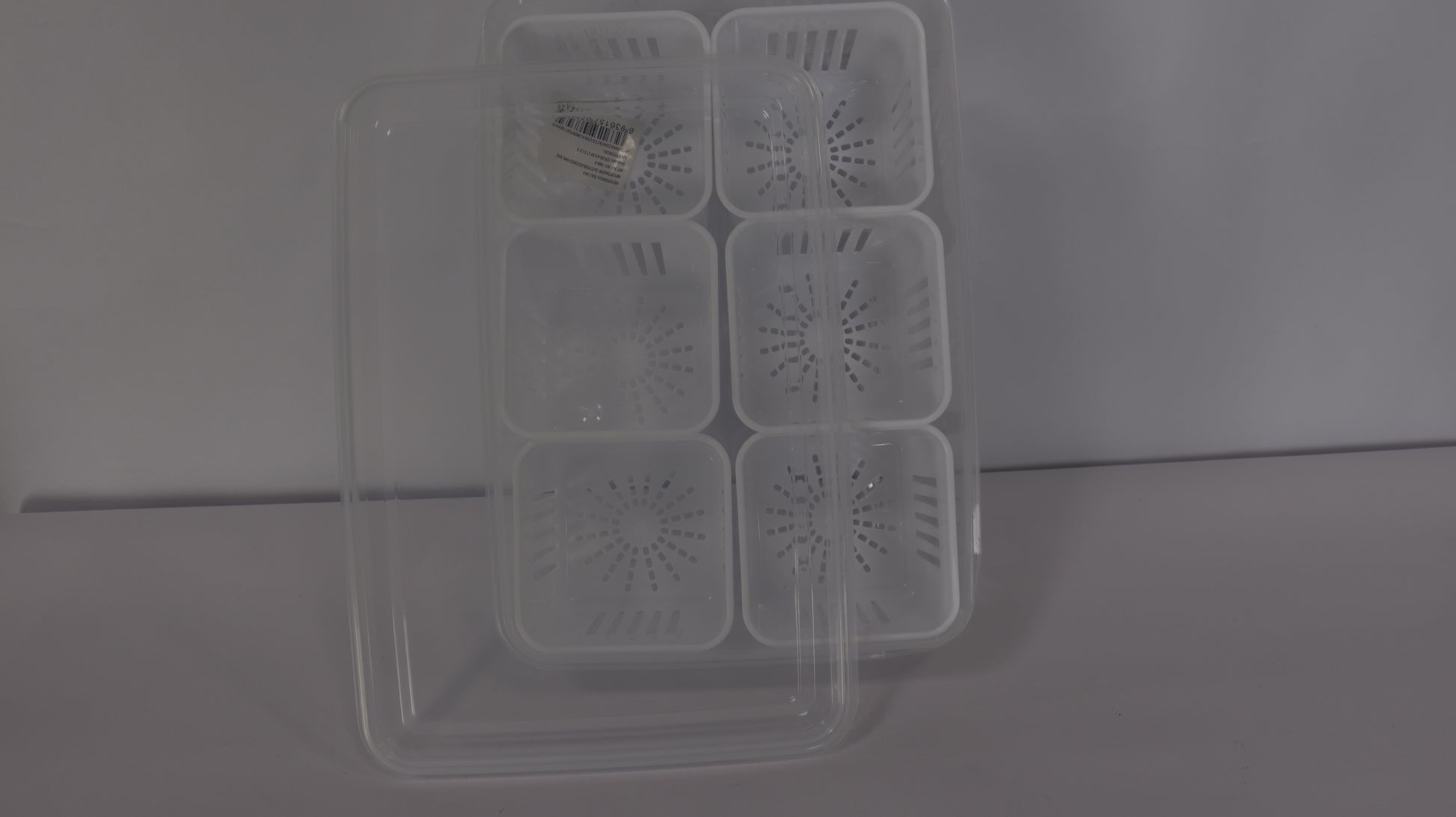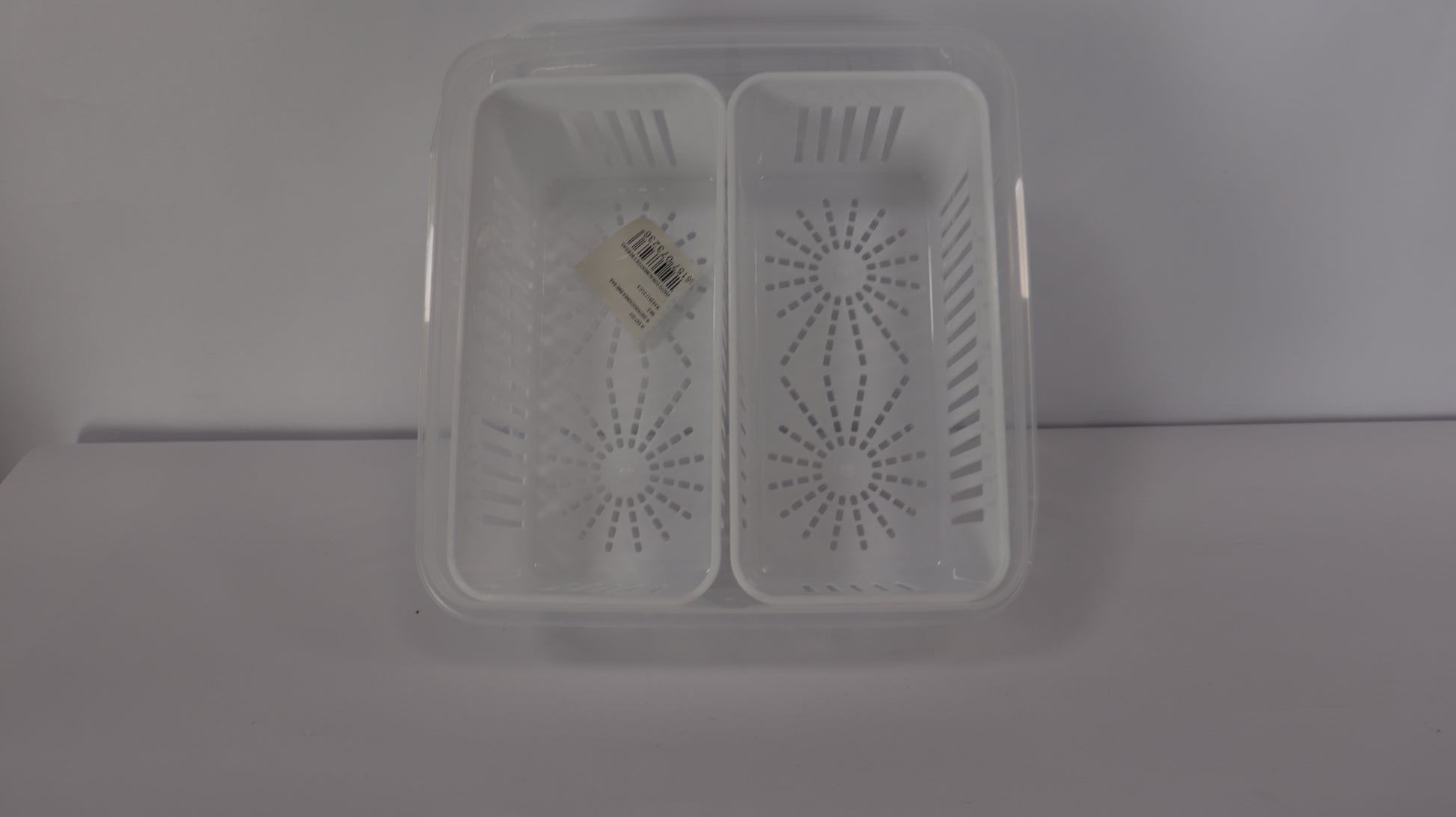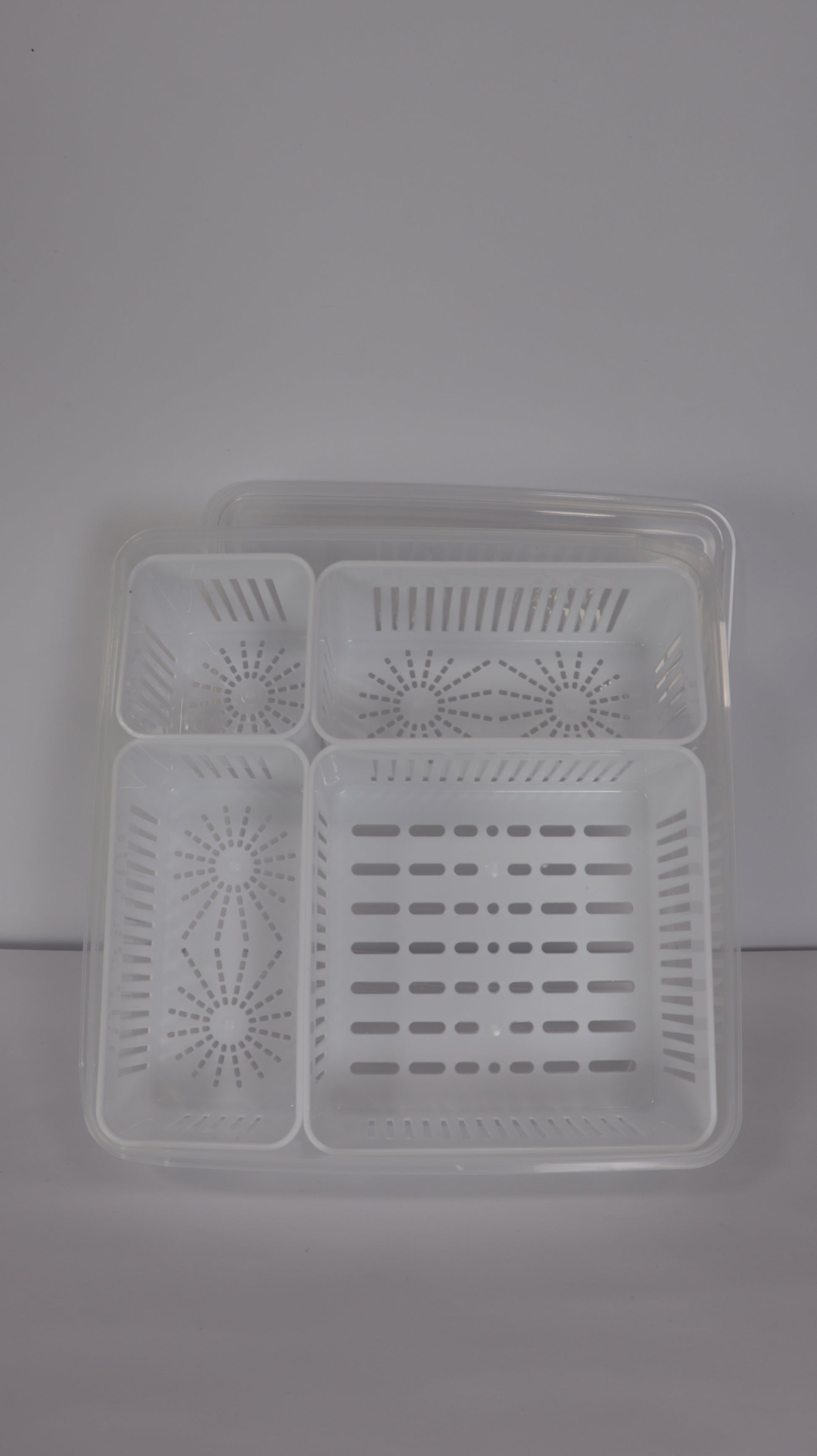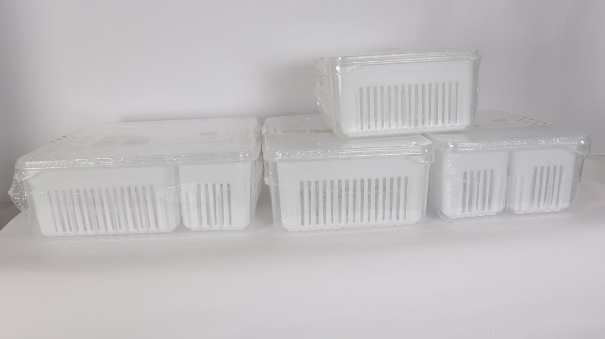 Los recipientes externos están fabricados en PET resistente y transparente, mientras que los escurridores internos en plástico blanco permiten separar la humedad y mejorar la conservación.