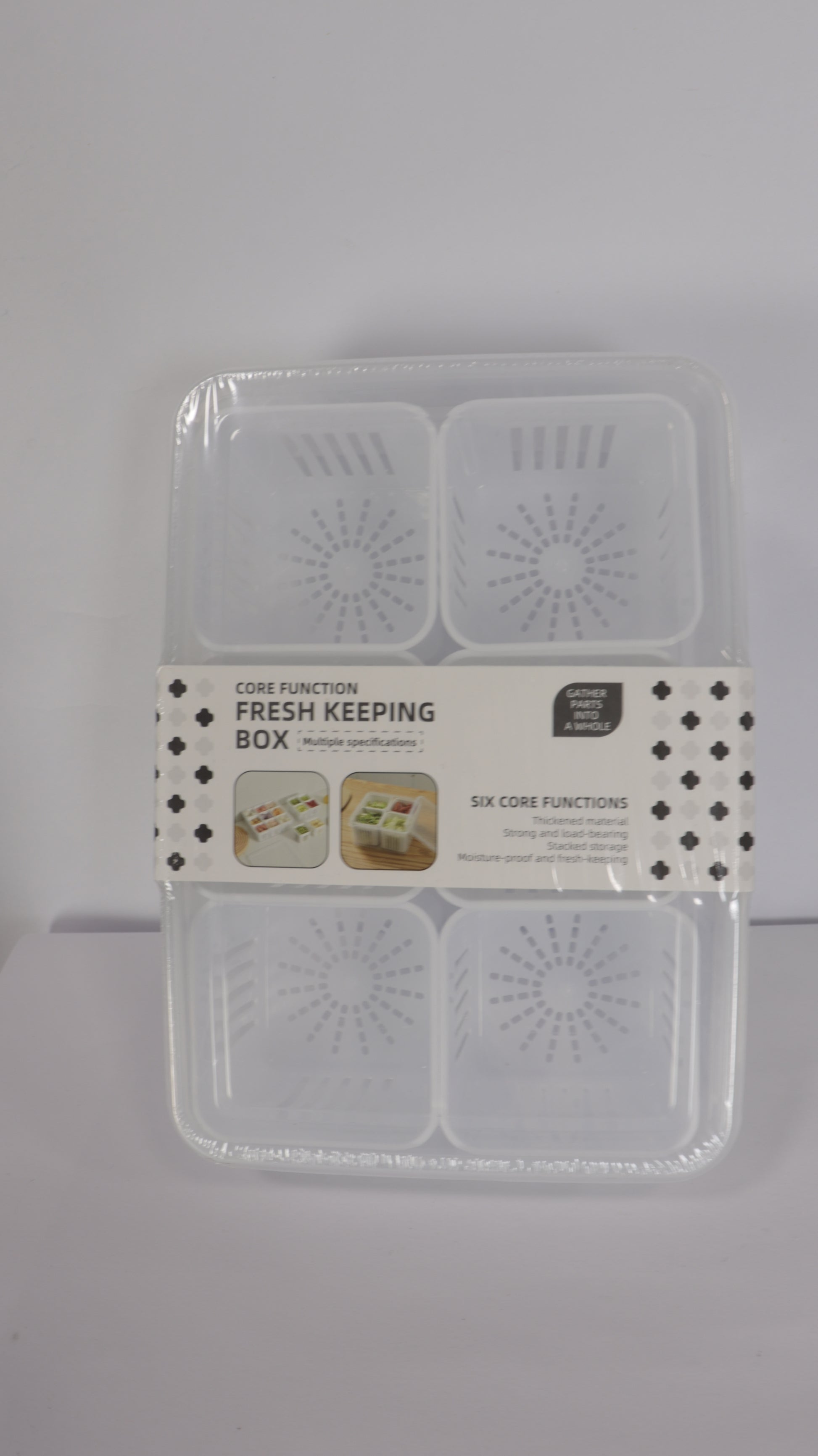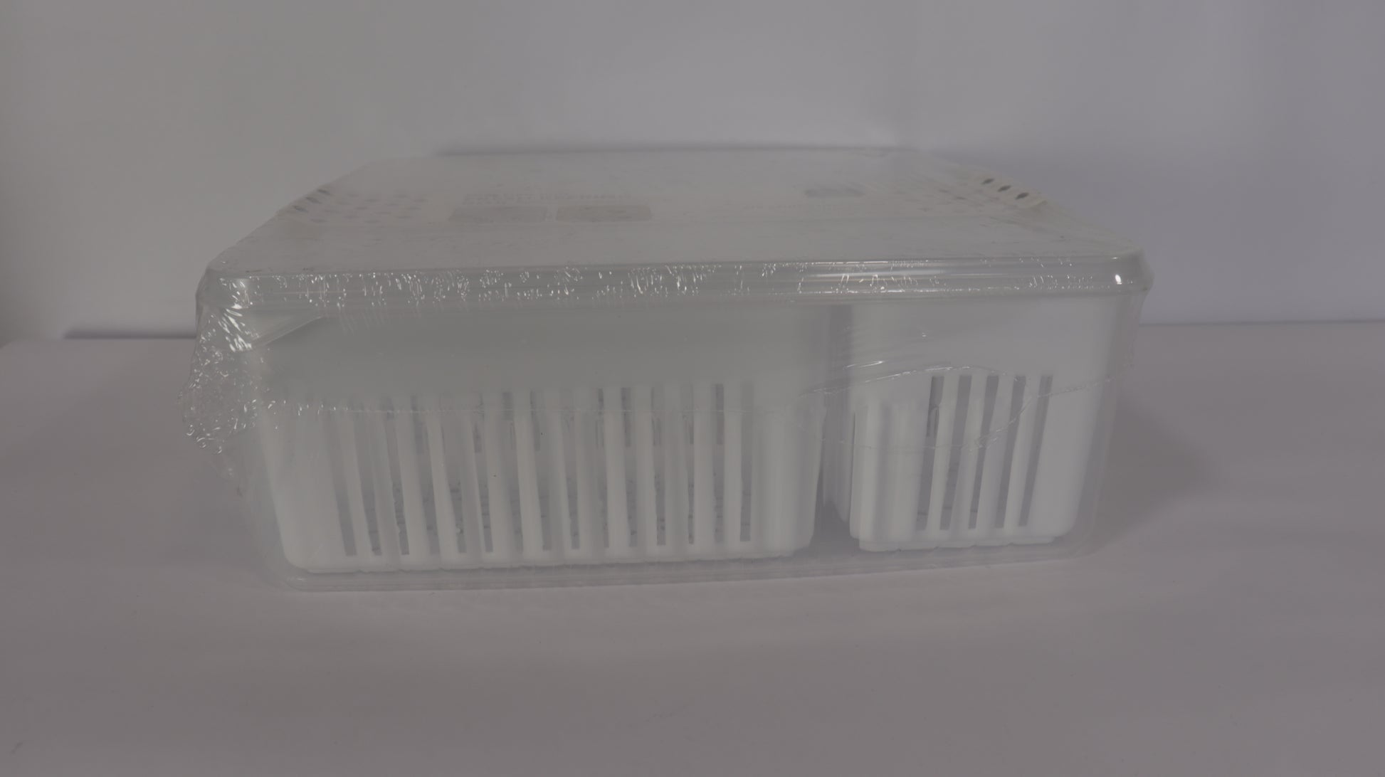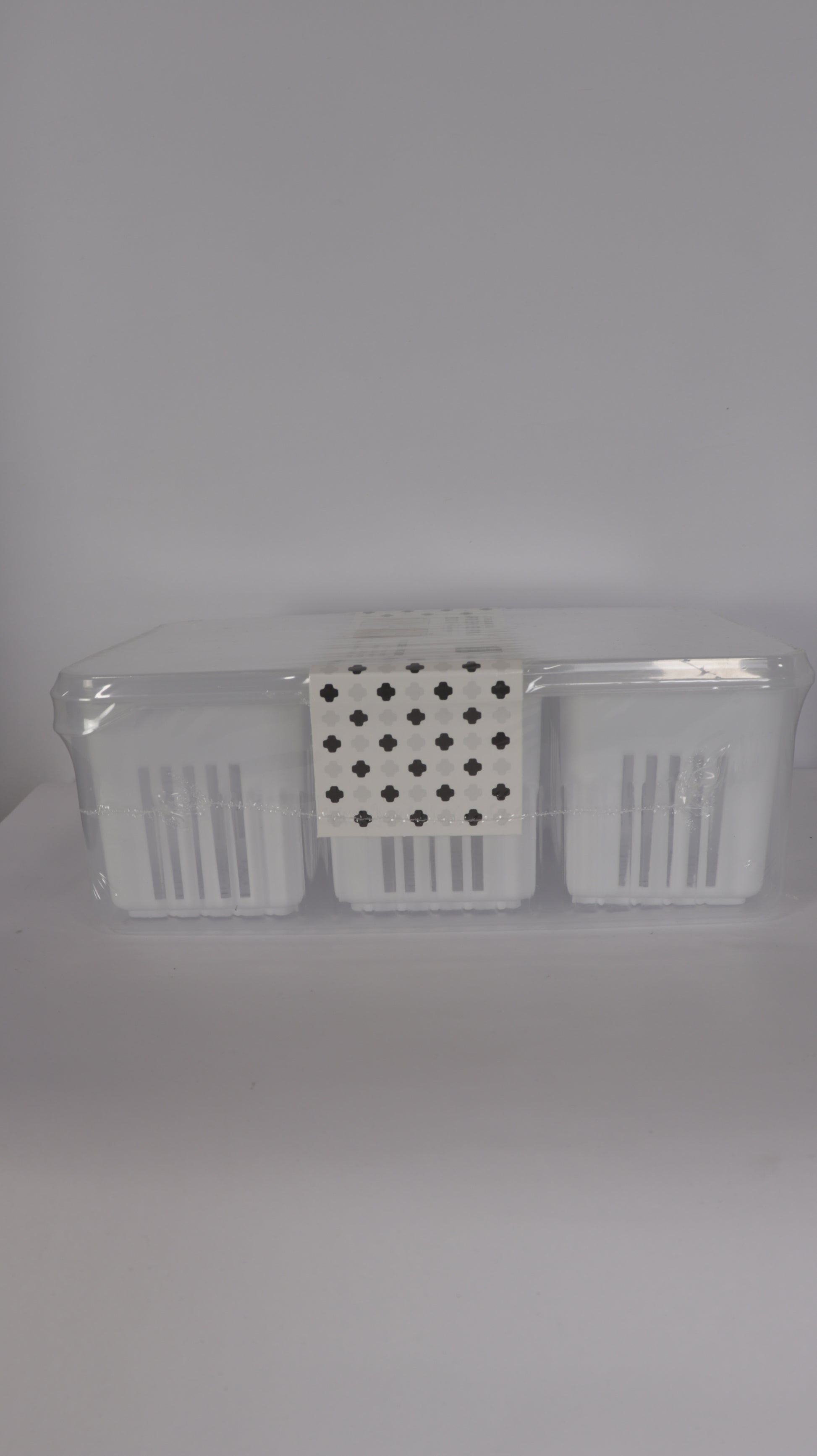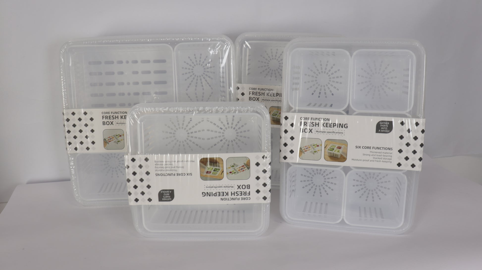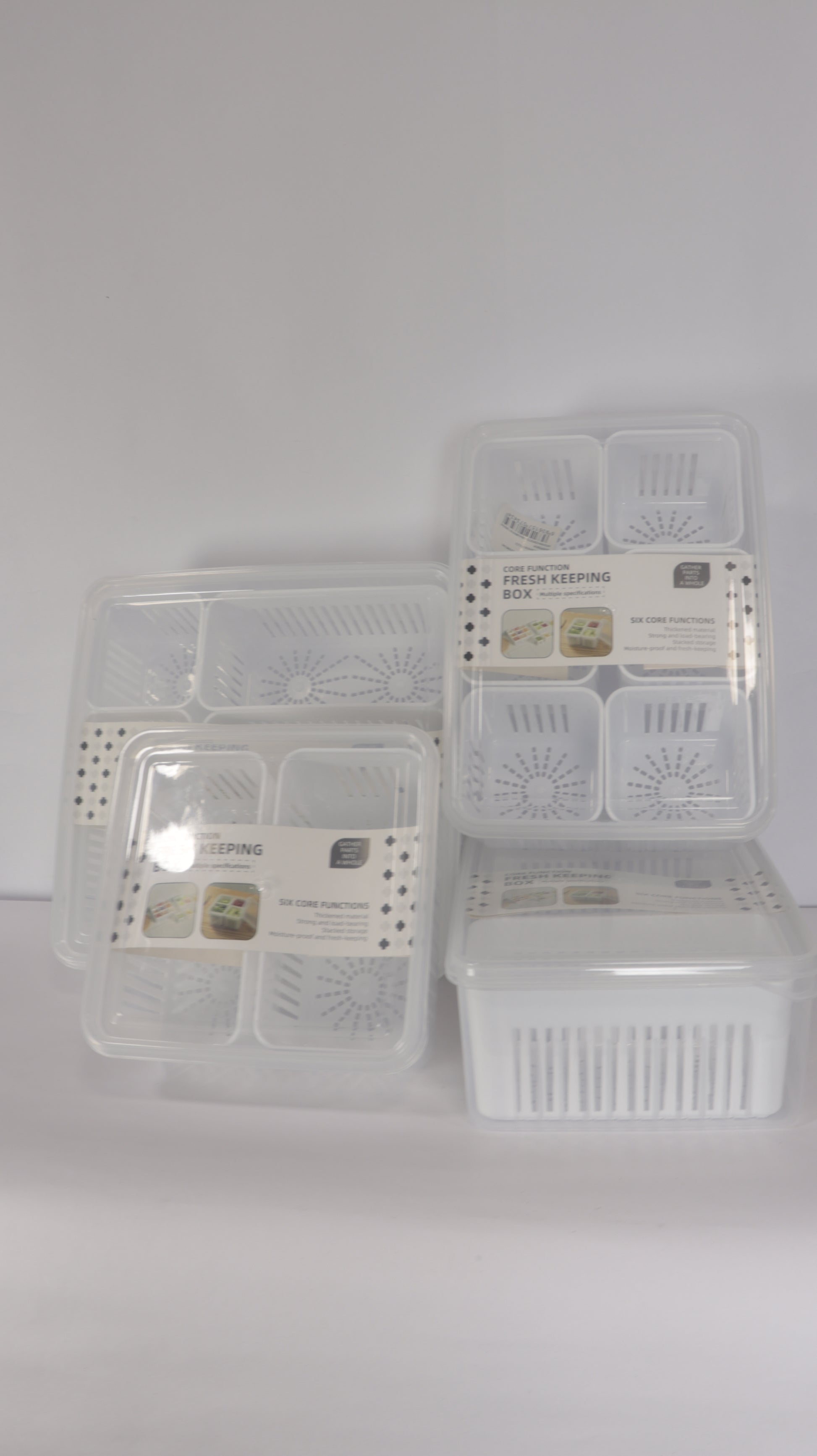 Los recipientes externos están fabricados en PET resistente y transparente, mientras que los escurridores internos en plástico blanco permiten separar la humedad y mejorar la conservación.