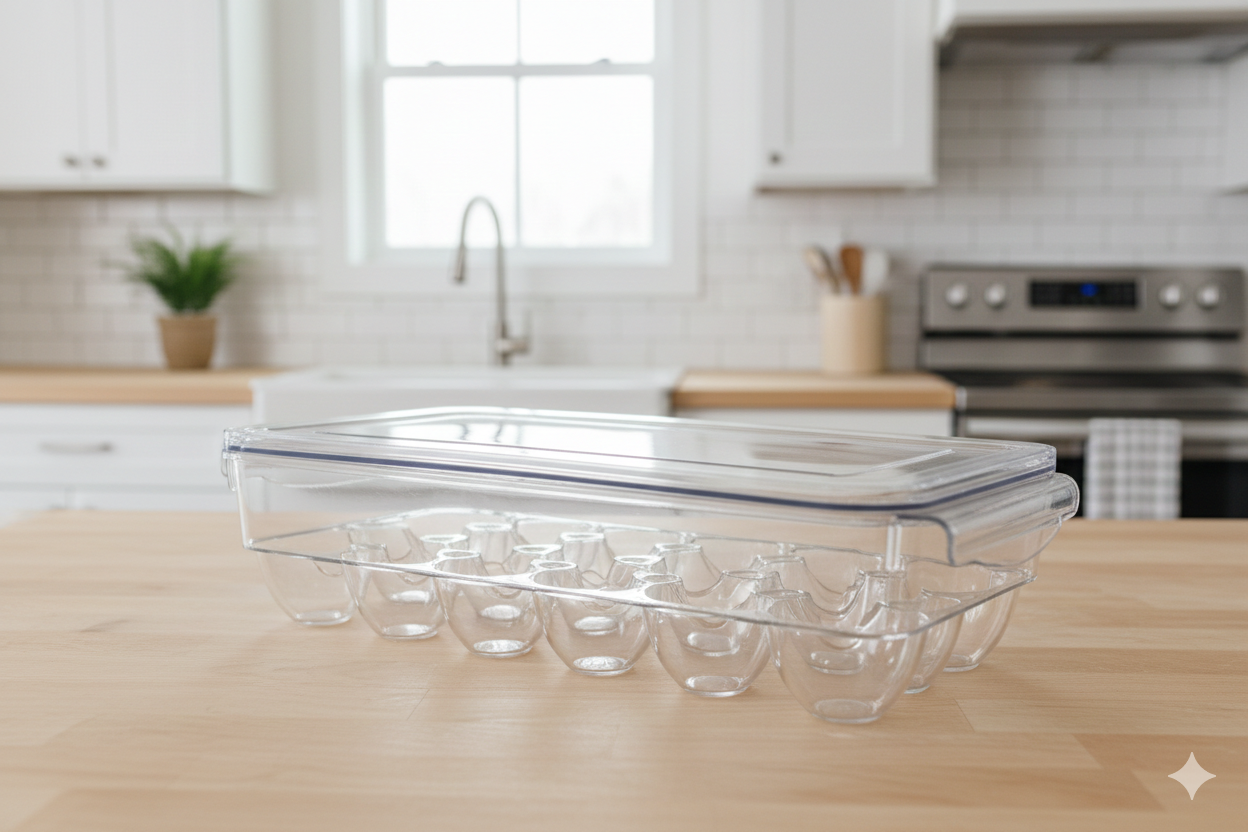 Fabricado en PET resistente y transparente, protege tus huevos de golpes y facilita la visualización del contenido sin necesidad de abrirlo.