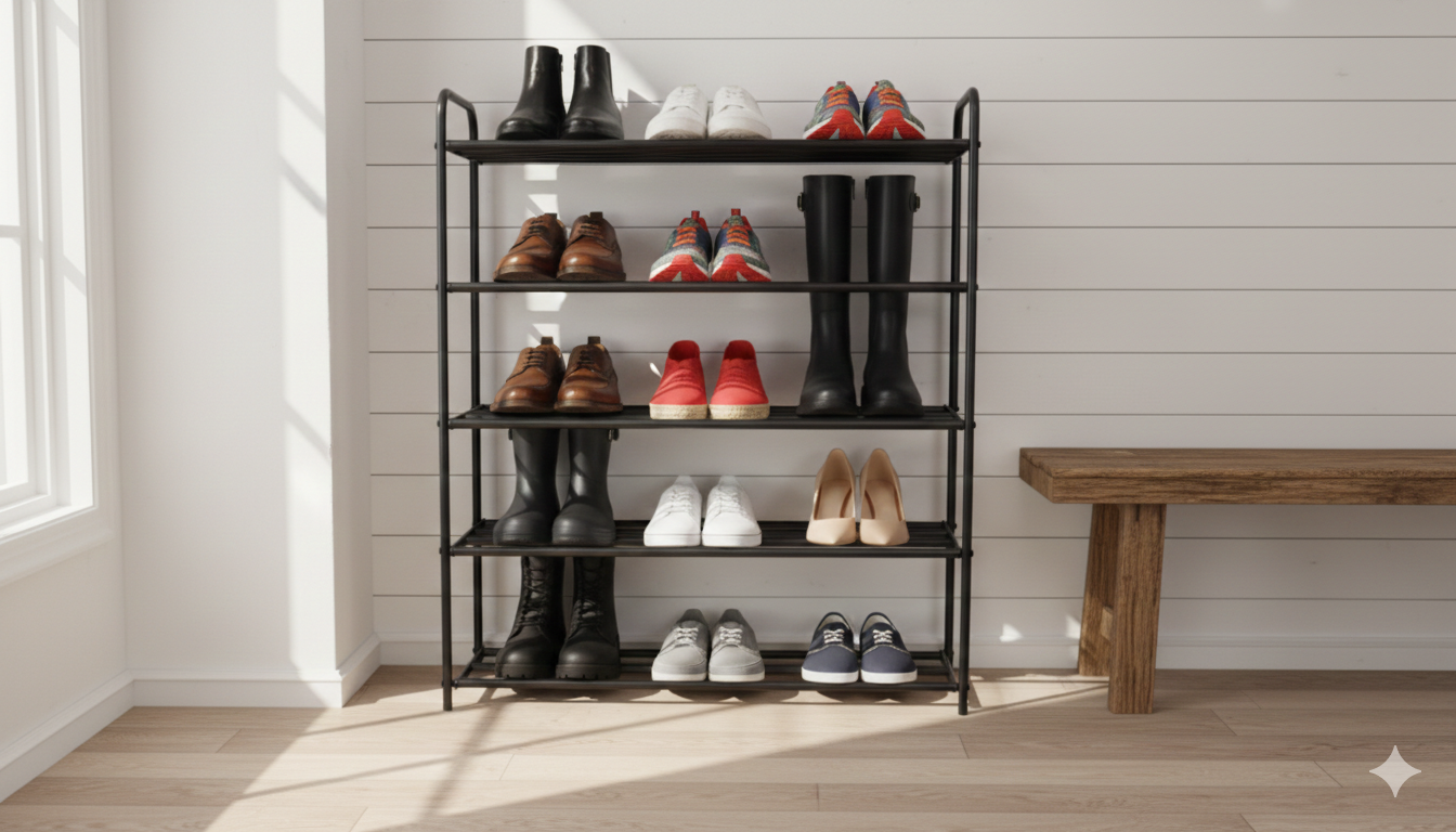 Su diseño fino y funcional permite almacenar varios pares sin ocupar demasiado espacio.